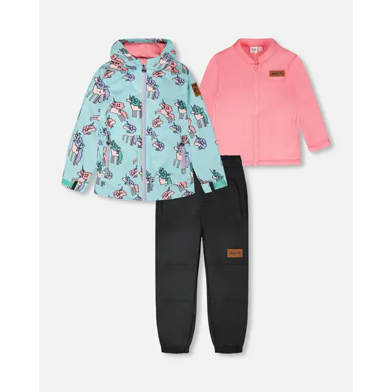 Детский демисезонный костюм Deux par Deux для девочки из коллекции весна/осень 2026 года. В комплект входят куртка, брюки и жакет из микрофлиса. Костюм изготовлен из высокотехнологичной мембранной ткани 3000/3000 с водоотталкивающей пропиткой. Данная ткань не промокает, хорошо защищает от ветра и сохраняет дышащие свойства. Брюки на коленях и по низу штанин усилены износостойким материалом Cordura.