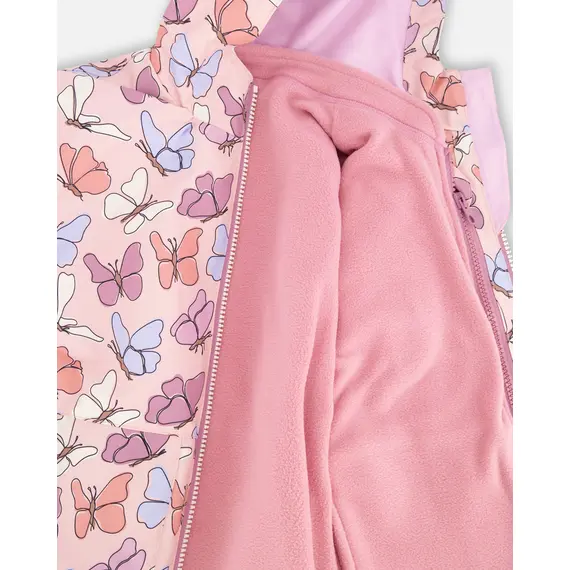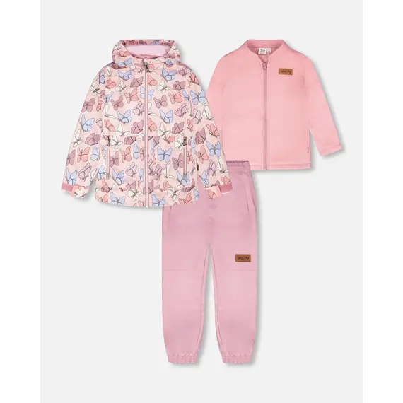 Детский демисезонный костюм Deux par Deux для девочки из коллекции весна/осень 2026 года. В комплект входят куртка, брюки и жакет из микрофлиса. Костюм изготовлен из высокотехнологичной мембранной ткани 3000/3000 с водоотталкивающей пропиткой. Данная ткань не промокает, хорошо защищает от ветра и сохраняет дышащие свойства. Брюки на коленях и по низу штанин усилены износостойким материалом Cordura.
