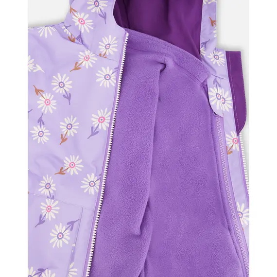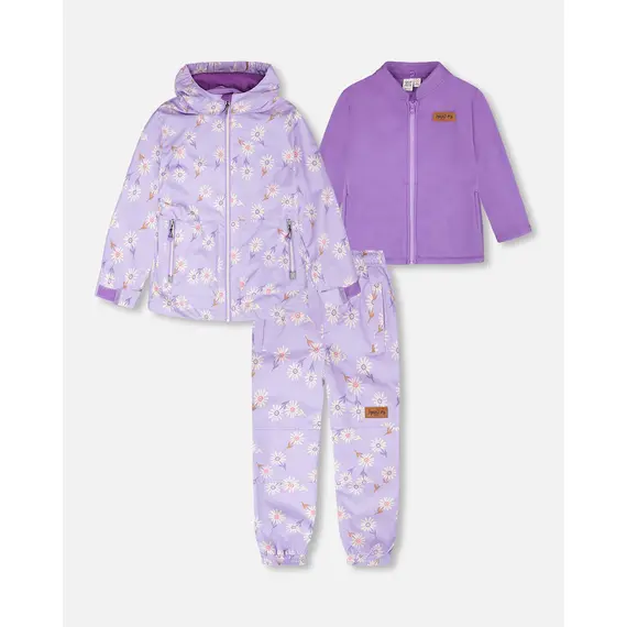 Детский демисезонный костюм Deux par Deux для девочки из коллекции весна/осень 2026 года. В комплект входят куртка, брюки и жакет из микрофлиса. Костюм изготовлен из высокотехнологичной мембранной ткани 3000/3000 с водоотталкивающей пропиткой. Данная ткань не промокает, хорошо защищает от ветра и сохраняет дышащие свойства. Брюки на коленях и по низу штанин усилены износостойким материалом Cordura.