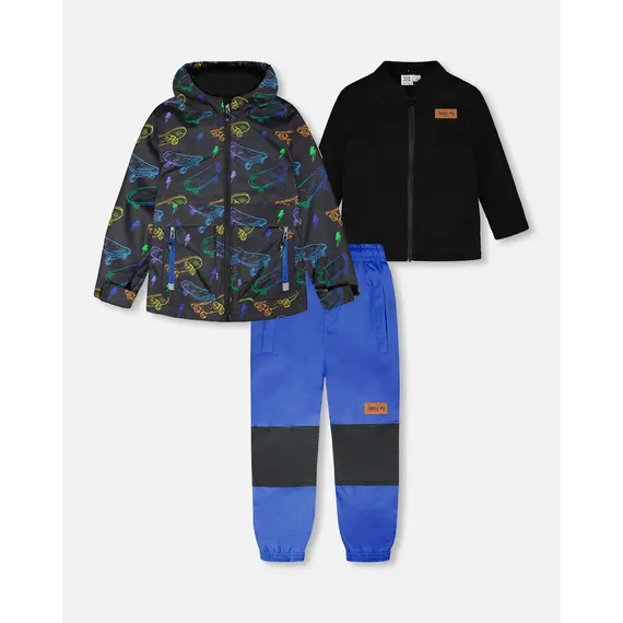 Детский демисезонный костюм Deux par Deux для мальчика из коллекции весна/осень 2026 года. В комплект входят куртка, брюки и жакет из микрофлиса. Костюм изготовлен из высокотехнологичной мембранной ткани 3000/3000 с водоотталкивающей пропиткой. Данная ткань не промокает, хорошо защищает от ветра и сохраняет дышащие свойства. Брюки на коленях и по низу штанин усилены износостойким материалом Cordura.
