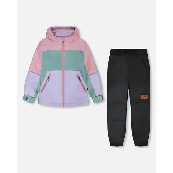 Детский демисезонный костюм Deux par Deux для девочки из коллекции весна/осень 2026 года. В комплекте идет куртка на комбинированной подкладке с микрофлисом и брюки на лямках. Костюм изготовлен из высокотехнологичной мембранной ткани 3000/3000 с водоотталкивающей пропиткой. Данная ткань не промокает, хорошо защищает от ветра и сохраняет дышащие свойства. В костюме используется искусственный утеплитель POLYFILL.