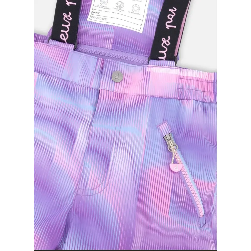 Брюки с эластичным поясом и съемными регулируемыми подтяжками. Два кармана на молнии с каждой стороны. Снегозащитная юбка по низу брюк. Усиленные колени, сиденье и низ брюк с помощью износостойкой ткани Cordura. Система роста брюк до 10 см, регулируется при помощи кнопок.